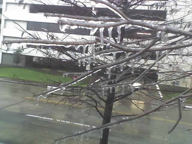 The big icy freeze everyone has been waiting for to skip out of work and school, finally blew threw last night. The conditions were so bad, there was even a couple of icicles (1/2″ to 1″ long) on these branches near my office. Be careful driving out there.icicles