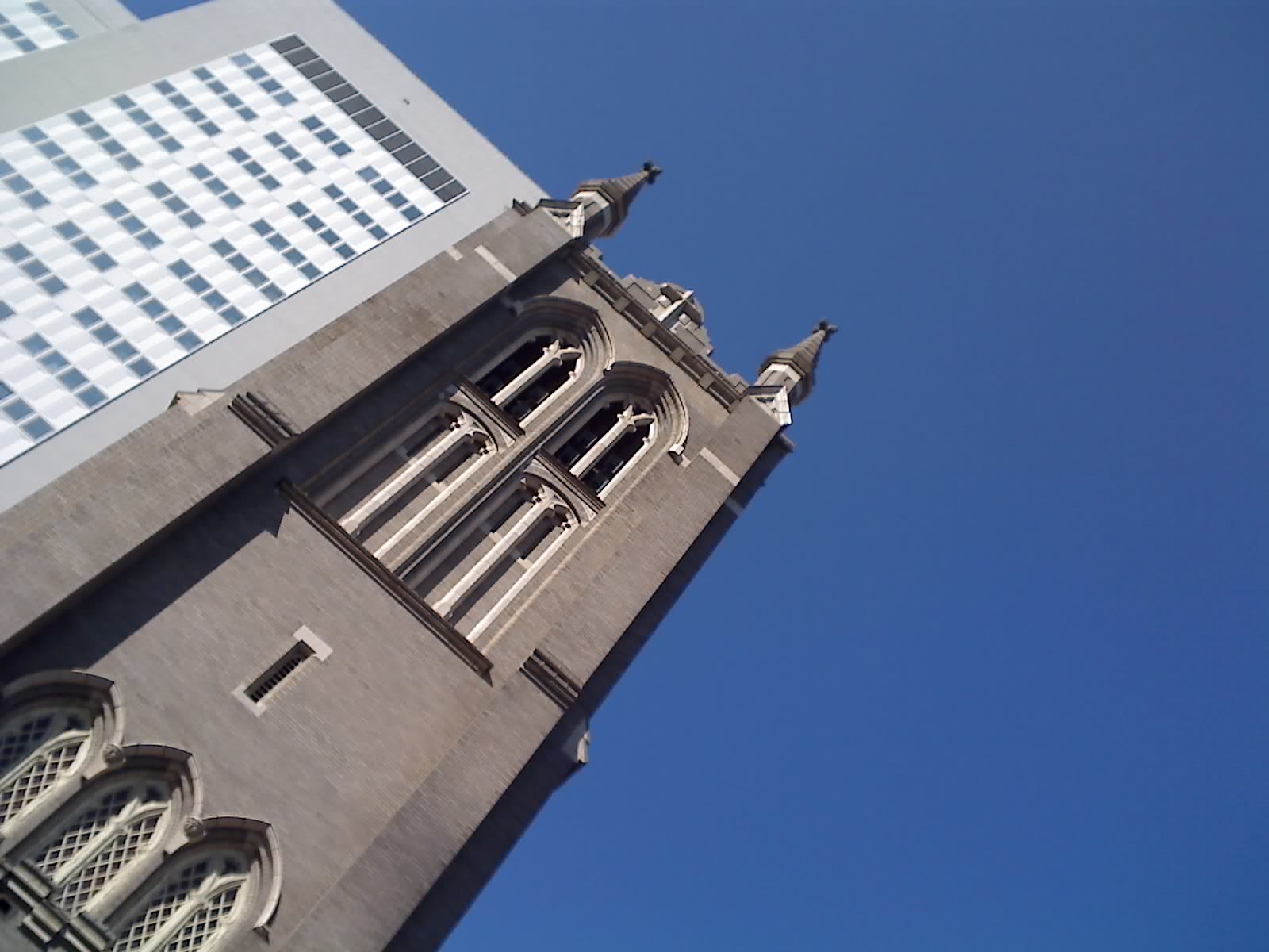 The First Methodist Church steeple on Main St. Downtown Houston is drawfed by the high rises surrounding it.