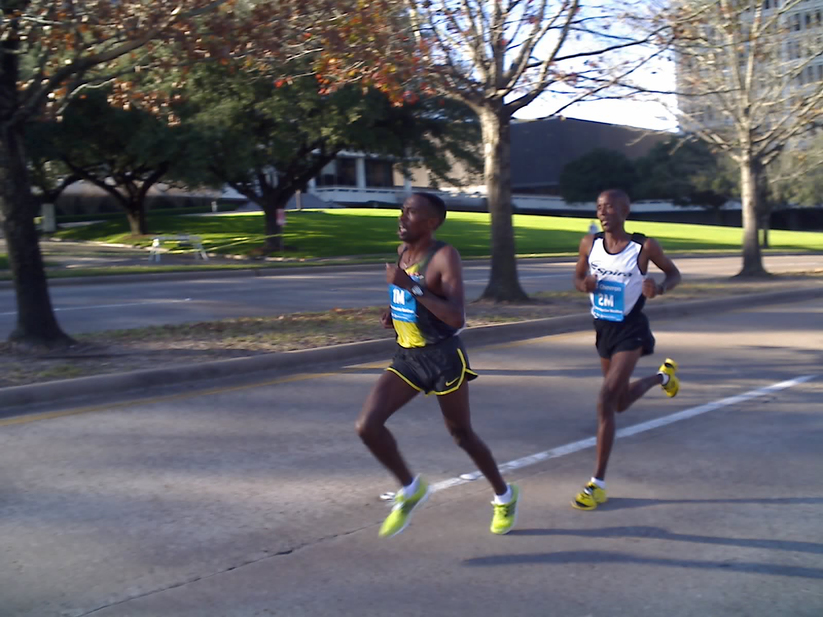 9:00am Kasime Adilo and David Cheruiyot pacing each other at mile 23.