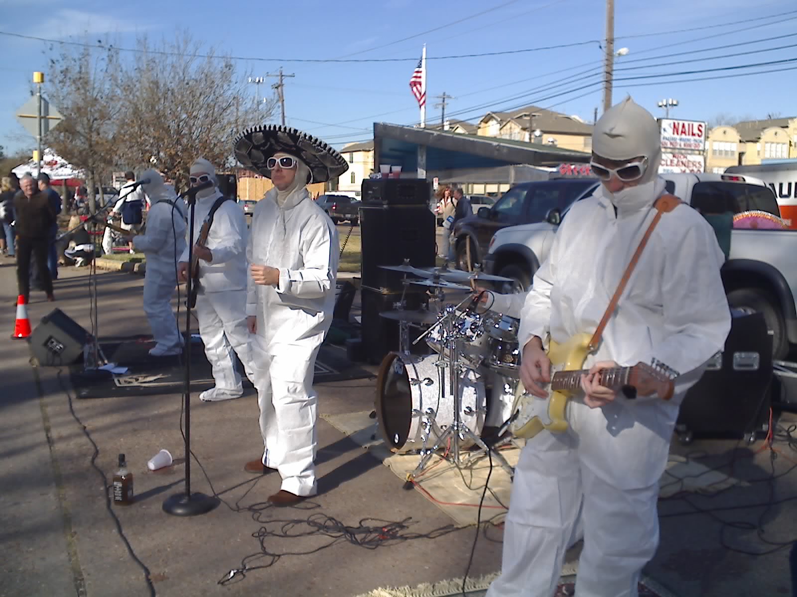 10:04am White jumpsuit dudes jamming on Memorial Drive