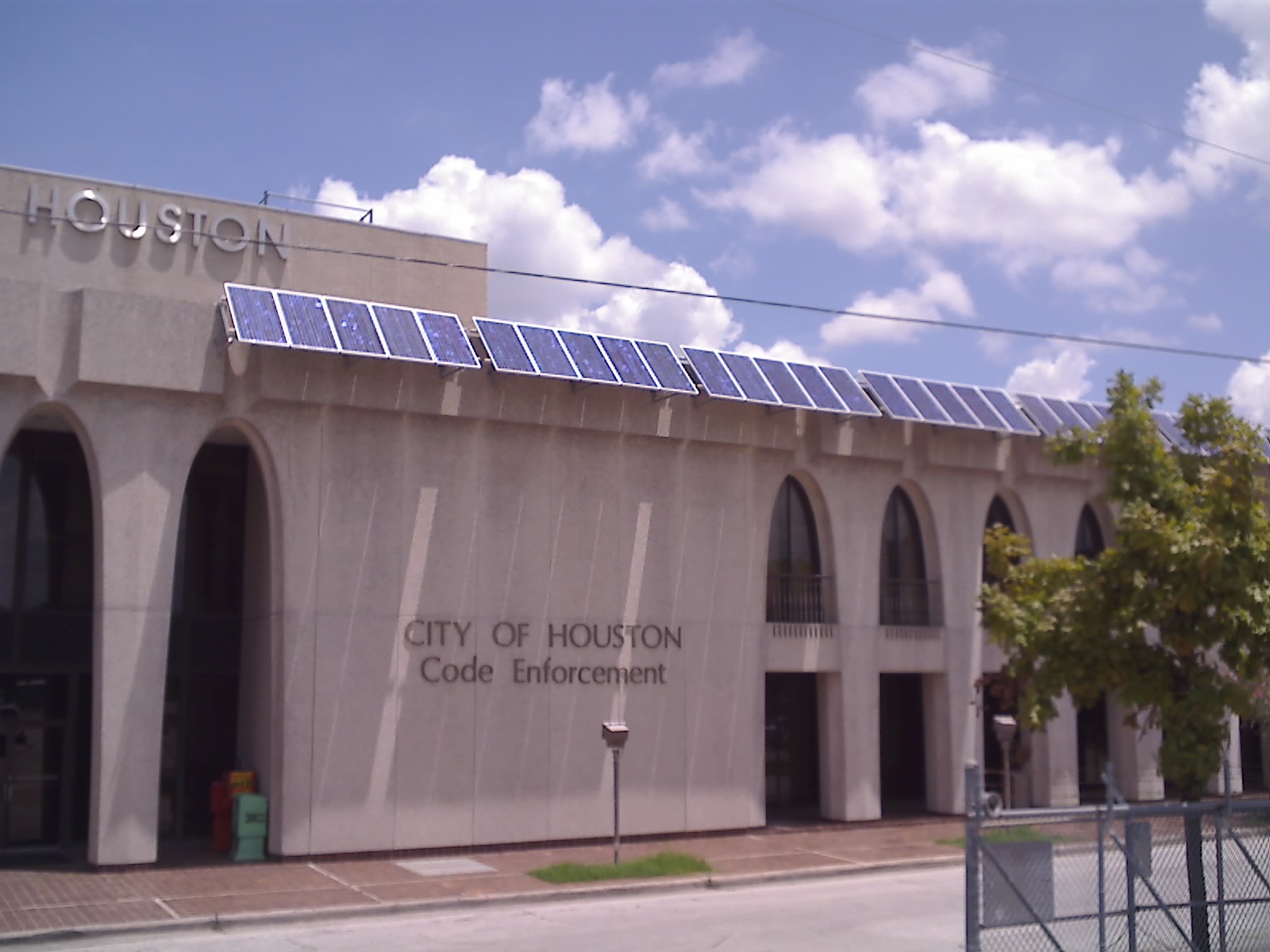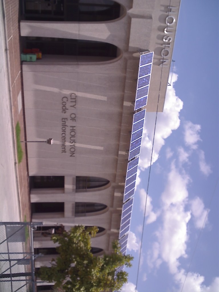 City of Houston Code Enforcement office put in a few solar photovoltaic panels recently. According to the City of Houston website, this 12 KW solar panel system was donated by BP. What you see here are 40 panels facing south which will only generate a small fraction of this building’s daily energy needs.