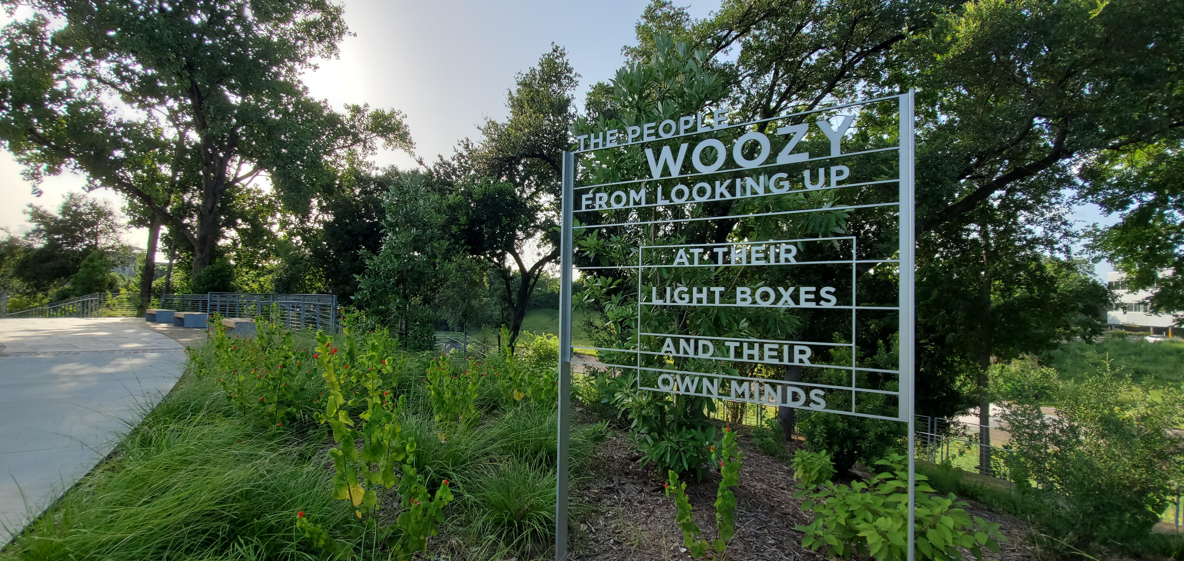 Spotted along the new section along the White Oak hike and bike trail near Studemont. The people woozy from looking up at their light boxes and their own minds.